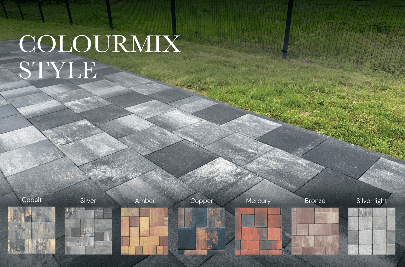 Colourmix is a multi-colour combination technology that creates a unique design and colour effect. This technology ensures that each paving stone has an individual and distinct colour. The natural and harmonious Colourmix colour transition is available in 7 different shades – Mercury, Silver, Silver Light, Amber, Bronze, Copper and Cobalt.