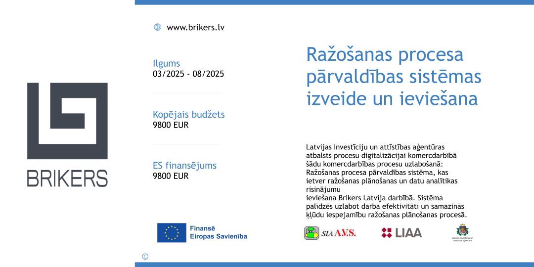 Sadarbībā ar Latvijas Investīciju un attīstības aģentūru Brikers Latvija 2025.gadā ir ieviesis jaunu ražošanas procesu parvaldības sistēmu, kas palīdzēs efektīvāk plānot produktu ražošanu un izejvielu iepirkumus. Projektu bija iespējams īstenot programmas atbalsts procesu digitalizācijai uzņēmējdarbībā ietvaros.